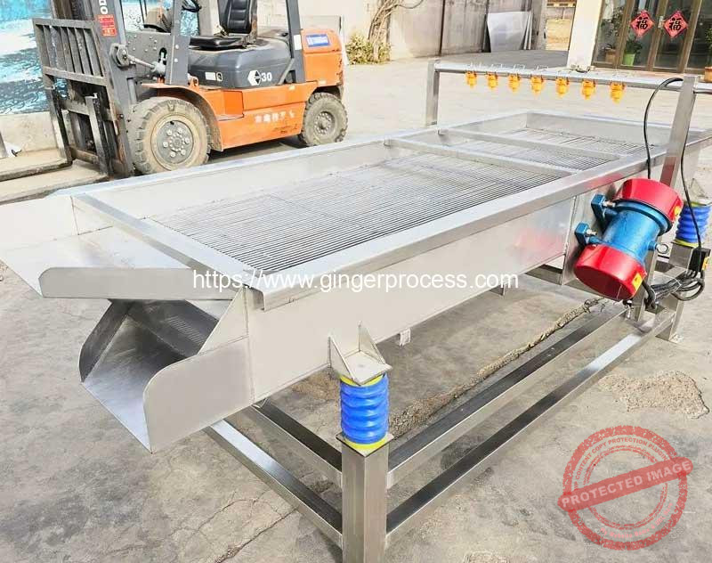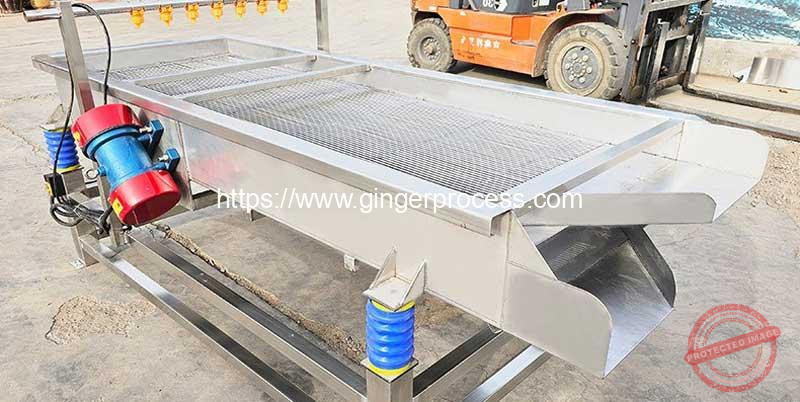 Cut or sliced ginger is evenly fed onto the vibrating screen surface. The machine generates controlled vibration, allowing smaller pieces to pass through the mesh while larger pieces move forward. Ginger of different sizes is discharged from separate outlets. This process ensures accurate grading and continuous operation.